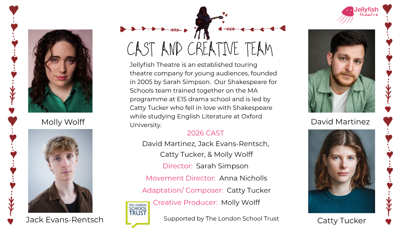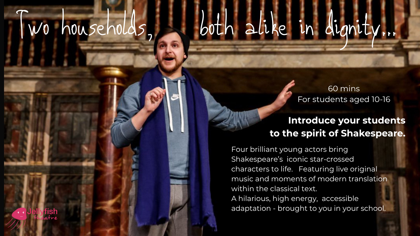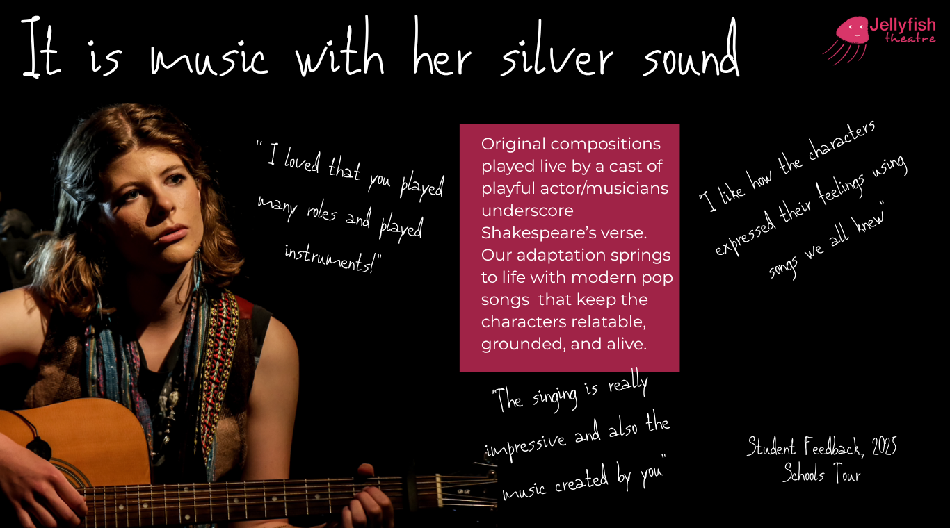 Our Shakespeare for Schools programme began in 2024 with a commission to adapt “A Midsummer Night’s Dream” to an accessible 60 minute production for schools. Now in our third year, we are delighted to add our fresh, playful adaptation of “Romeo and Juliet”.