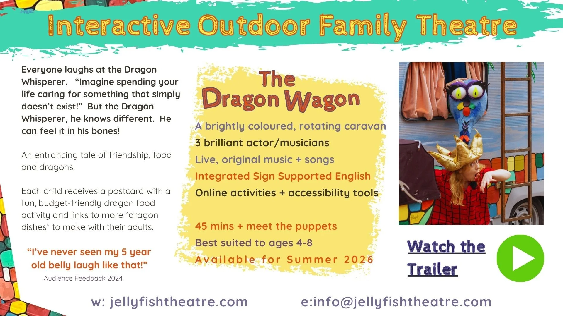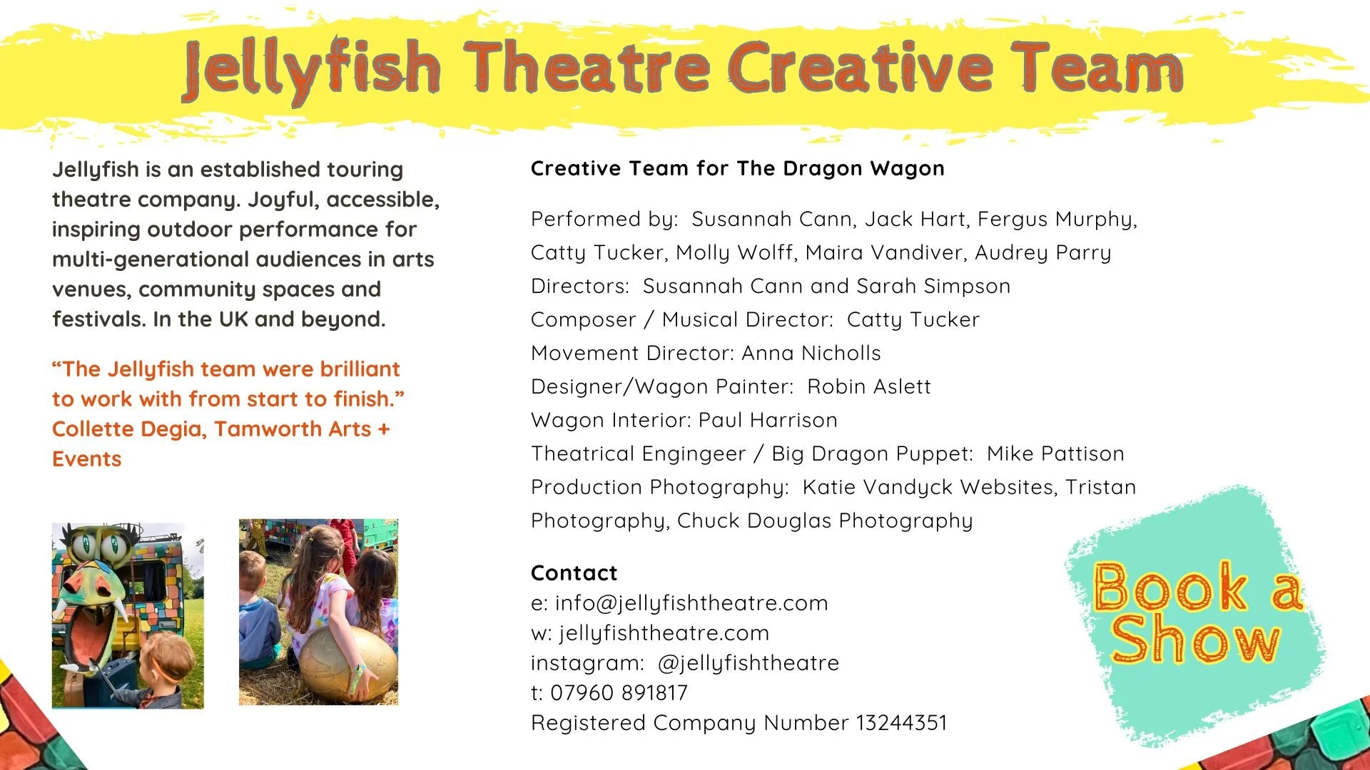 โThe Dragon Wagonโ is our brilliant outdoor summer theatre show. Reach out if youโd like to find out about our outdoor work for summer 2026.
